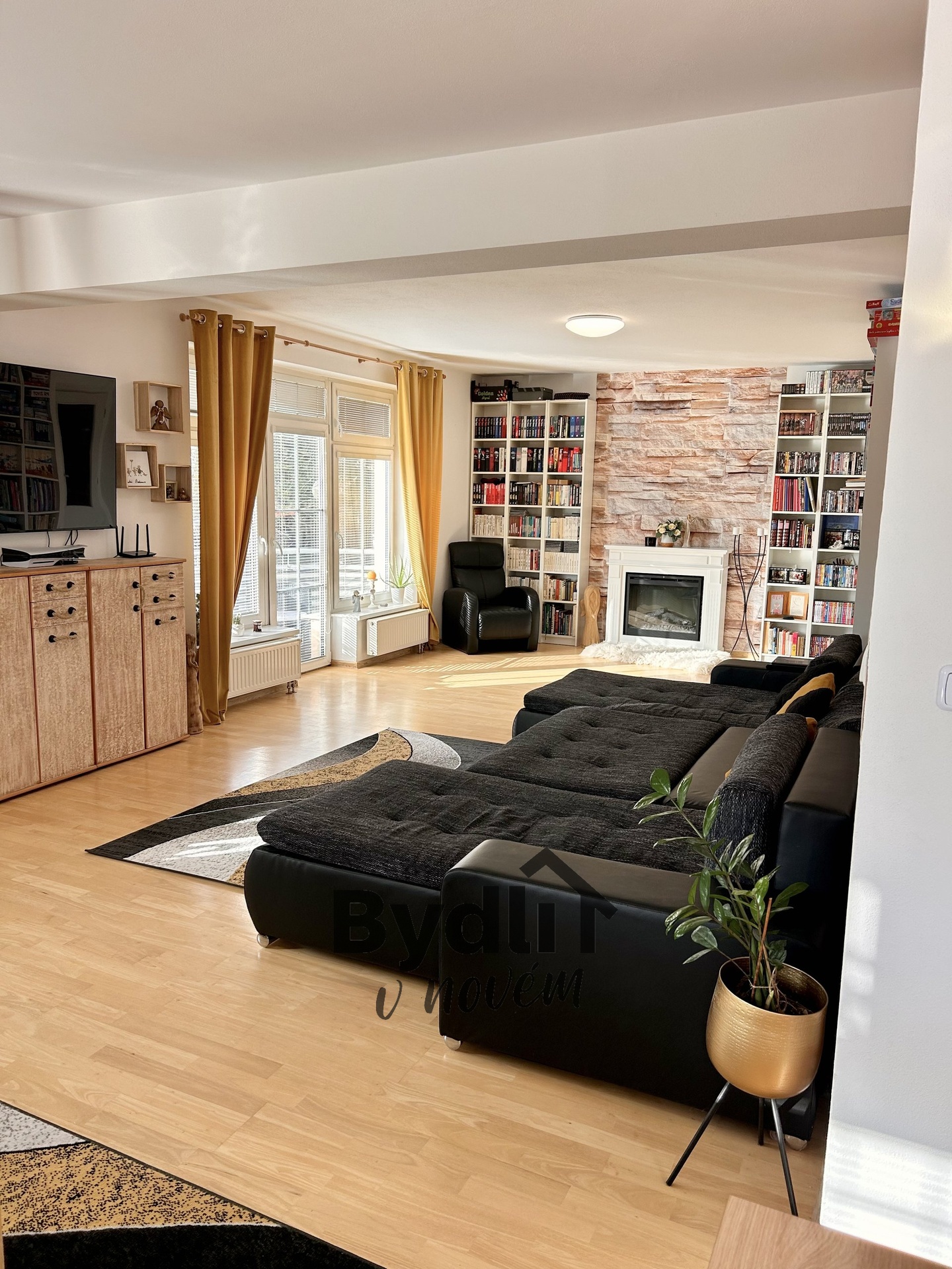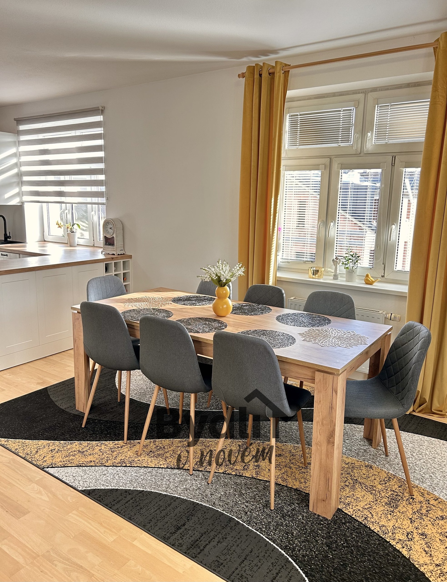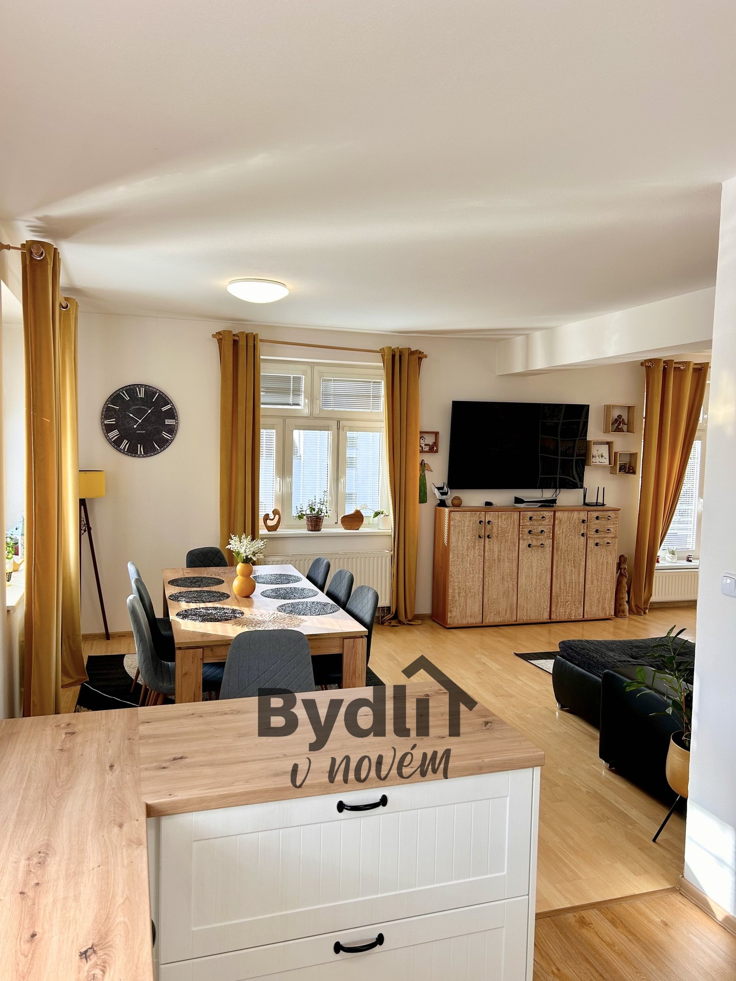 Dominantou bytu je prostorný obývací pokoj s nádhernou dubovou podlahou.