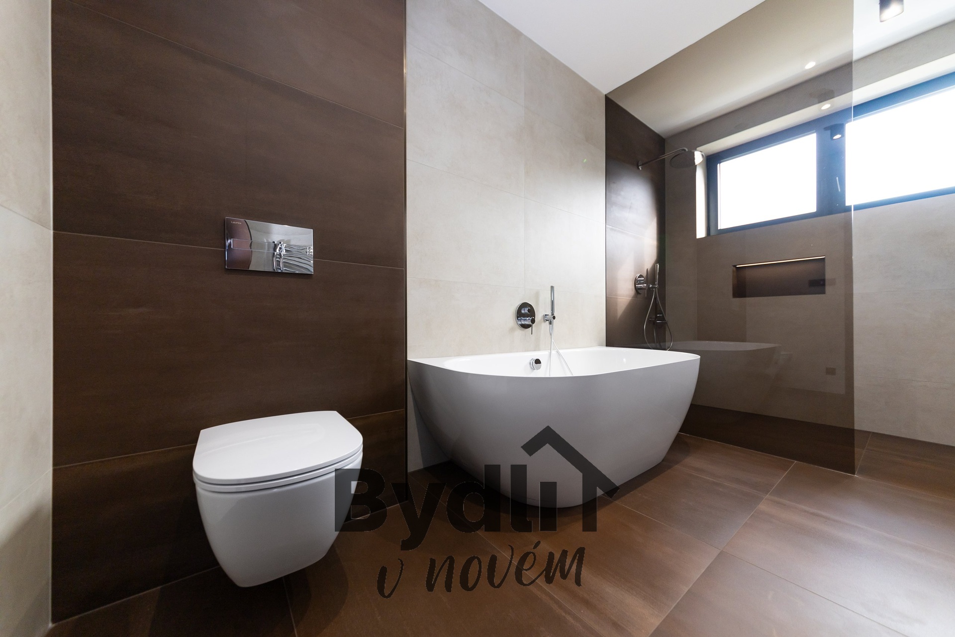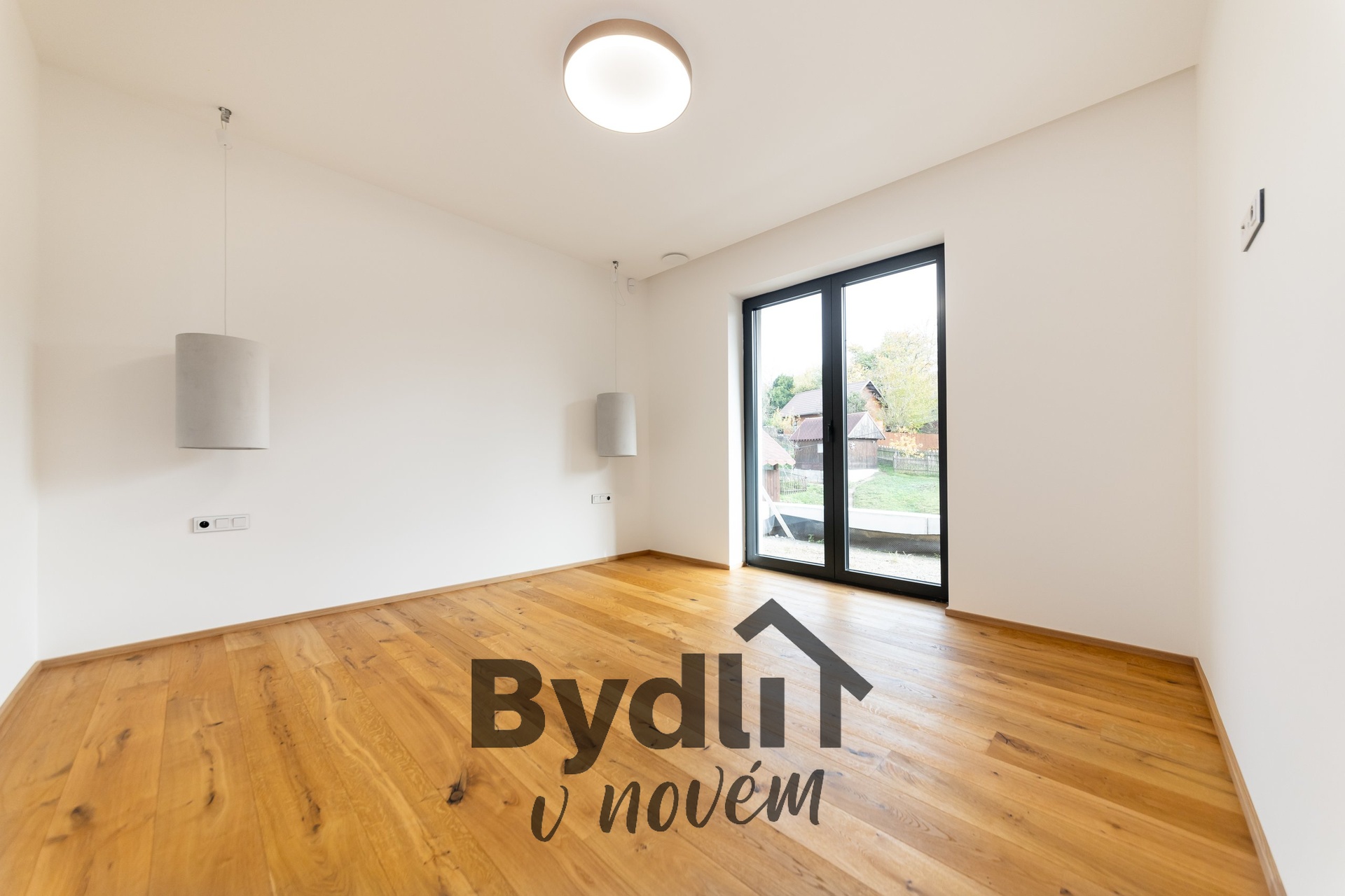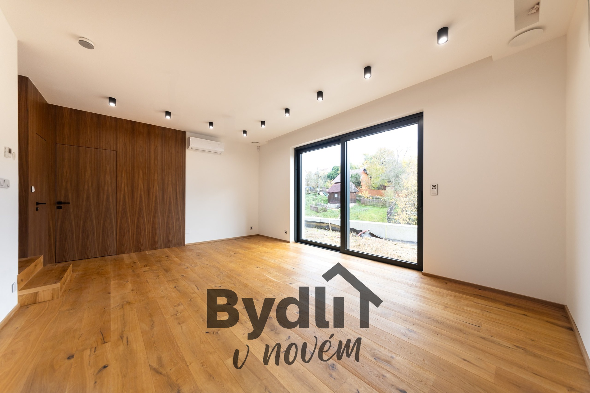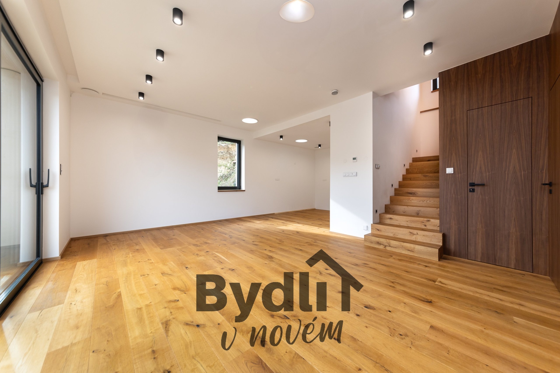 Elegantní schodiště s proskleným zábradlím vás zavede do spodního patra, jehož dominantou je prostorný obývací pokoj. Tento prostor je připraven pro instalaci kuchyňské linky a nabízí úchvatný výhled do zahrady. Dále se zde nachází další obytná místnost a ložnice s přilehlou koupelnou, prádelnou, toaletou pro hosty a kumbálem.